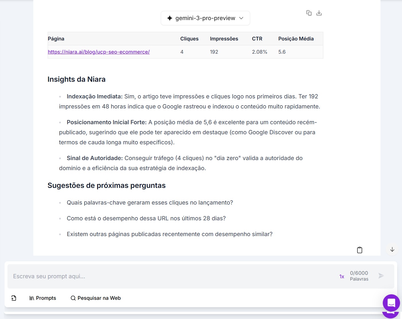 Perguntei no ChatSEO “@gsc niara, nós publicamos o artigo https://niara.ai/blog/ucp-seo-ecommerce/ no dia 19 de janeiro. Ele teve impressão e/ou cliques no mesmo dia ou no dia seguinte? informe apenas os dados desta url.”