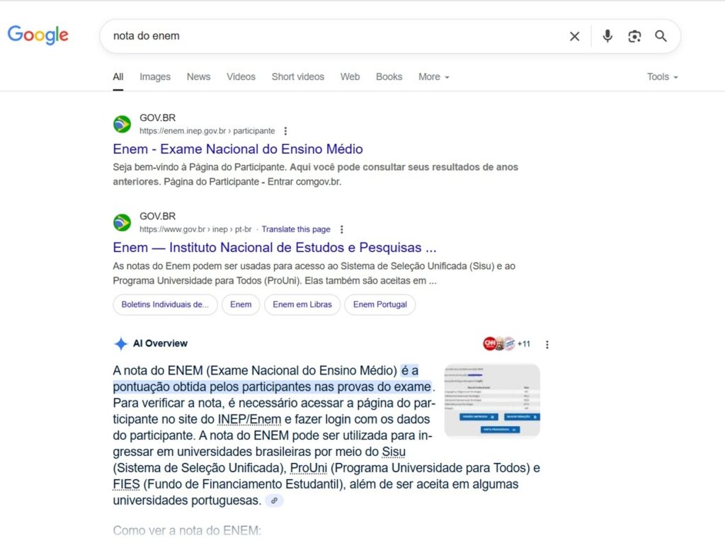 Buscas com intenção mista: No caso da busca por “nota do Enem” (print da SERP, abaixo), a intenção primária do usuário é transacional: ele quer saber sua nota. No entanto, o Google não tem acesso a essa informação pessoal. Reconhecendo essa falha, o sistema de IA entende que a próxima melhor coisa a fazer é responder a uma intenção secundária e informacional: como ele pode obter essa nota. Por isso, ele exibe primeiro a resposta de um site de forte autoridade que pode guiar o usuário. Em seguida, ele tenta responder a dúvidas principais com um Query Fan-Out, desdobrando a consulta em “como ver a nota”, “como a nota pode ser utilizada”, etc. A IA é inteligente o suficiente para saber que a melhor resposta para a intenção inicial não pode ser dada por ela.