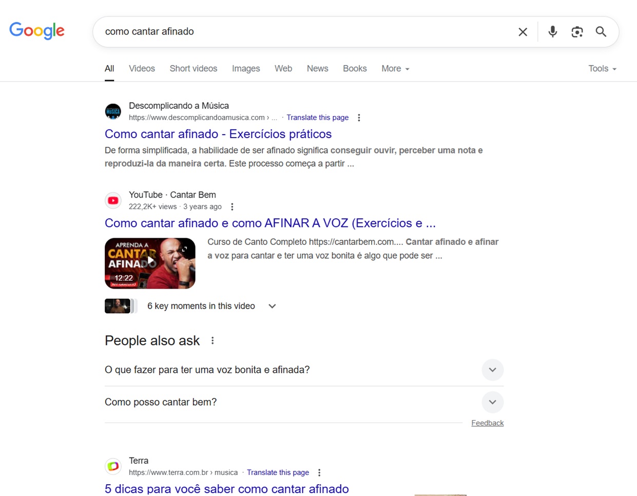 Para a intenção informacional complexa, o Google entende que o texto não é o melhor formato para a resposta. A SERP para “como cantar afinado” é dominada por vídeos do YouTube e artigos com embeds de vídeo, porque a melhor forma de aprender a afinar a voz é vendo e ouvindo um instrutor.