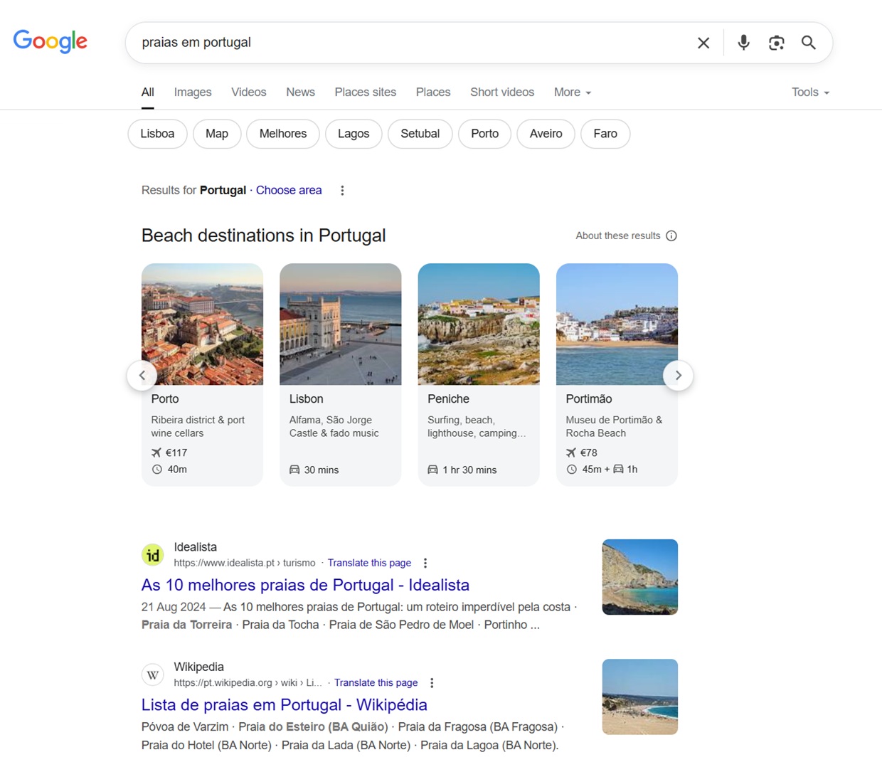 Tentar exibir um resumo ou aplicar um Query Fan-Out aqui, desdobrando em ‘praias no Algarve’, ‘praias em Lisboa’, etc., seria menos eficiente do que deixar o usuário explorar as opções visuais.
