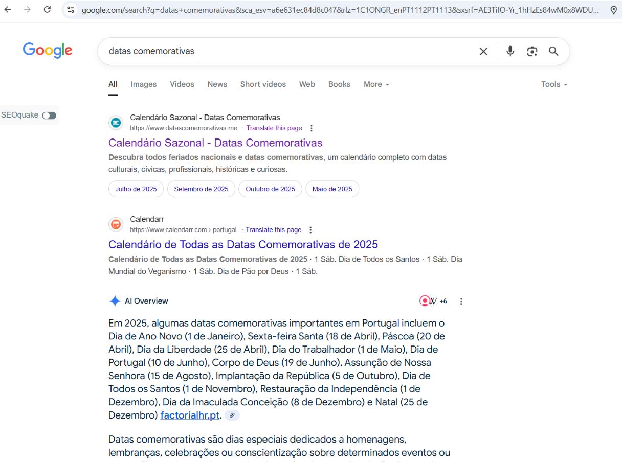 Buscas por formatos específicos: Se o usuário busca uma lista completa de datas, como “datas comemorativas de 2025”, um calendário ou uma lista bem organizada em um site pode ser considerada a resposta mais útil. A IA do Google não consegue entregar a mesma experiência que o usuário teria no site.