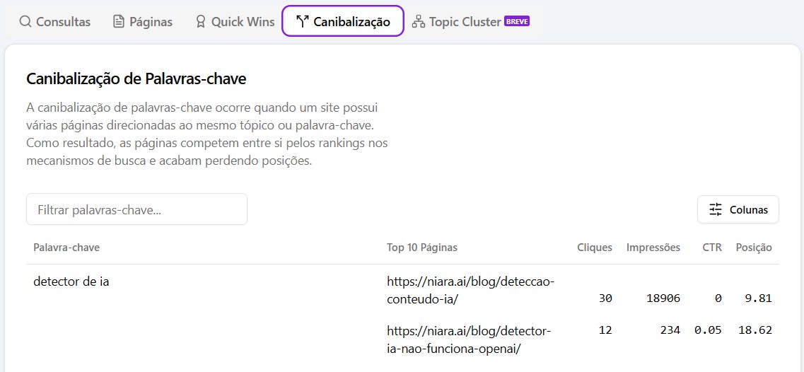 “Esta página manteve a posição média, mas perdeu CTR porque novas consultas emergentes passaram a disputar atenção no mesmo resultado.”