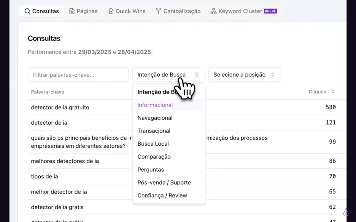 Adicionamos novos filtros que permitem segmentar os dados por intenção de busca e posição nos resultados de pesquisa. Essa funcionalidade ajuda a entender melhor como os usuários interagem com seu conteúdo.