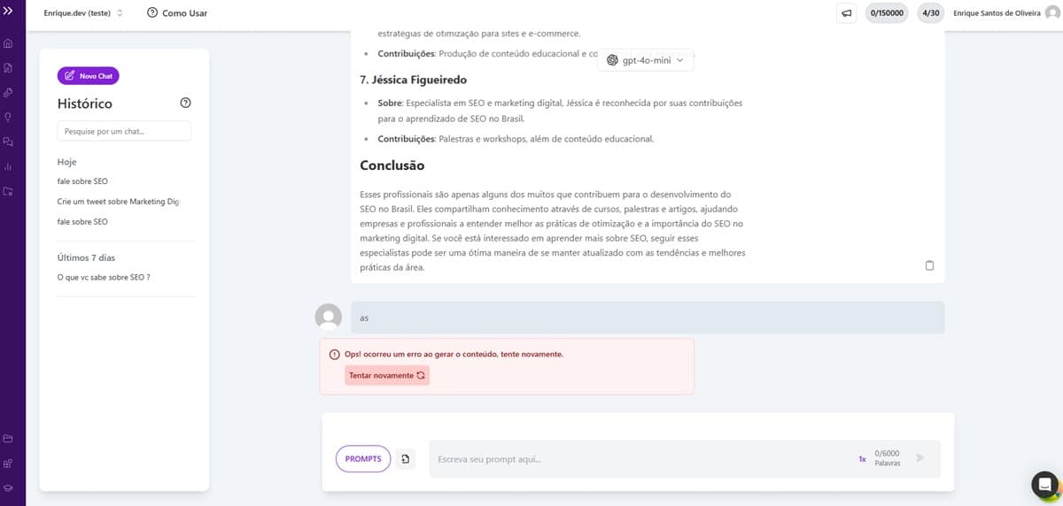 Melhoramos o tratamento de erros, permitindo que o usuário regere a mensagem em caso de erro, garantindo uma experiência mais fluida.