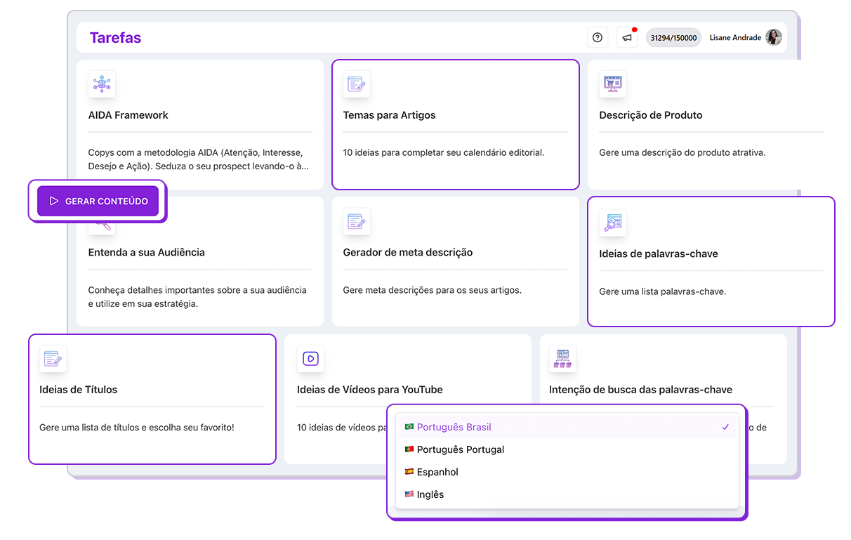 Além de Português do Brasil, você pode gerar conteúdo em Inglês (EUA/UK), Espanhol (LATAM/Espanha) e Português de Portugal – além de ter a possibilidade de mudar o idioma da interface da plataforma, como mostrado abaixo: