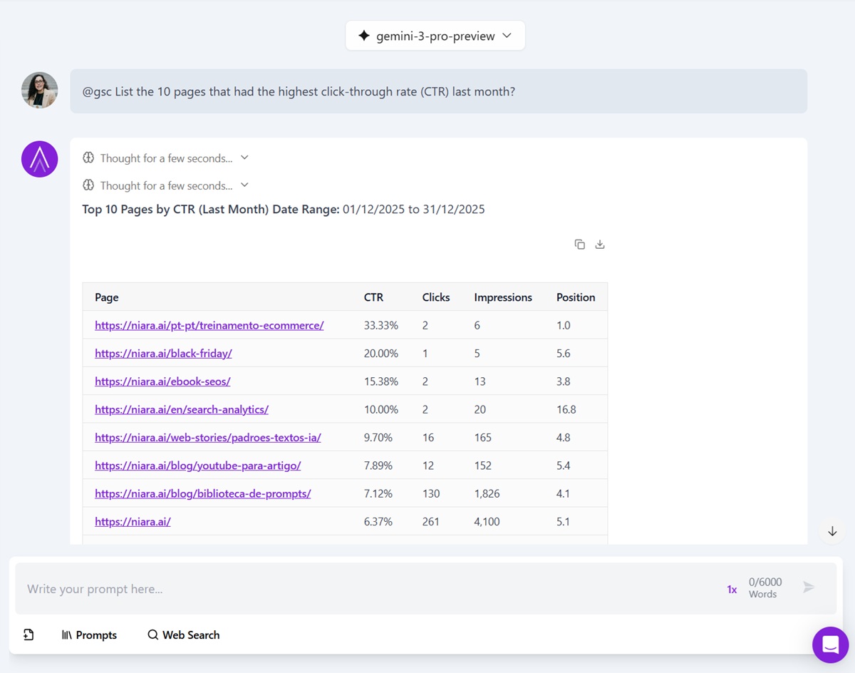 Instead of automatically “alerting” you, Niara allows the professional to actively discover problems by directly asking Search Console things like: which pages are losing visibility?, which terms dropped in position?, or which URLs have good average positioning but are underutilized in clicks? This eliminates reliance on continuous manual monitoring and transforms analysis into an investigative process guided by questions.