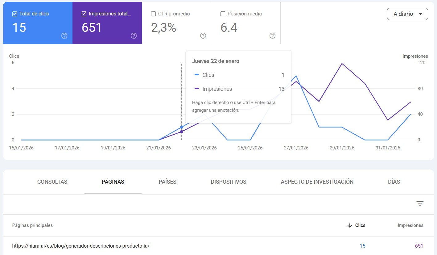Pero ese no es el único beneficio. Tu equipo también gana más eficiencia y reduce el retrabajo. Lo que se refleja en resultados más rápidos para tu negocio. O incluso al día siguiente, como demuestra la captura de pantalla abajo con el rendimiento de un artículo publicado en nuestro blog el día 21 de enero teniendo ya clics el día 22: